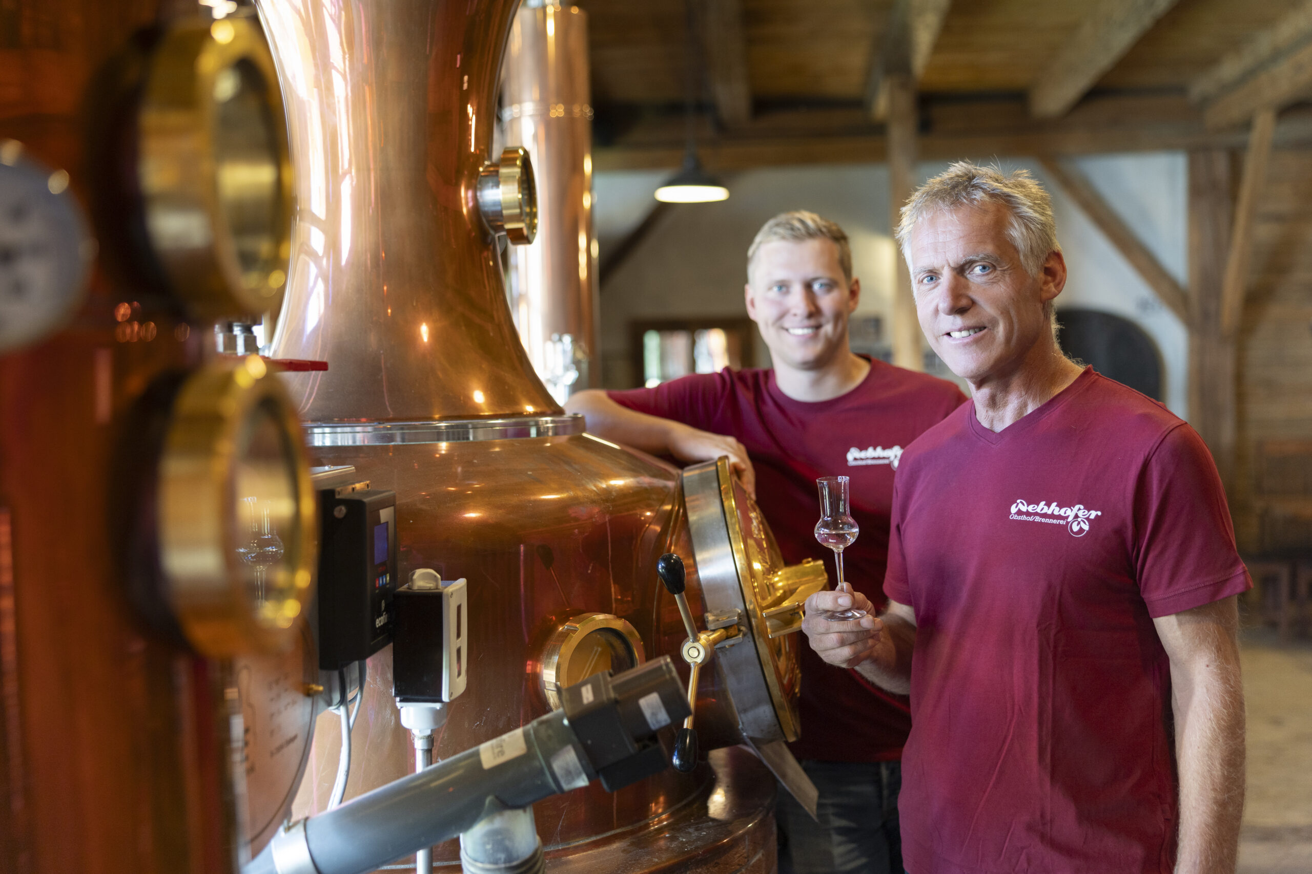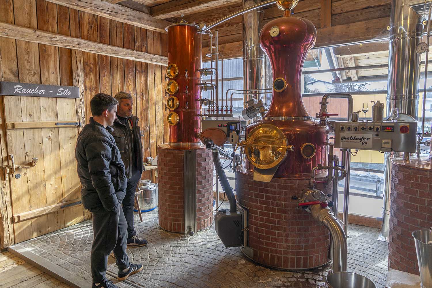 Der mit viel Holz gestaltete Stadel strahlt eine warme, gemütliche und zugleich authentische Atmosphäre aus – geprägt von grob behauenen Balken, dem knarzenden Riemenboden und schweren Nussholztischen, die zum gemeinsamen Verweilen einladen. Liebevolle Details, natürliche Materialien und kleine Einblicke in die umliegende Landschaft schaffen ein stimmiges Gesamtbild, in dem Handwerk und Natur spürbar werden. Die Brennanlage selbst ist sichtbar in den Raum integriert und macht die Kunst des Destillierens für Besucher unmittelbar erlebbar.